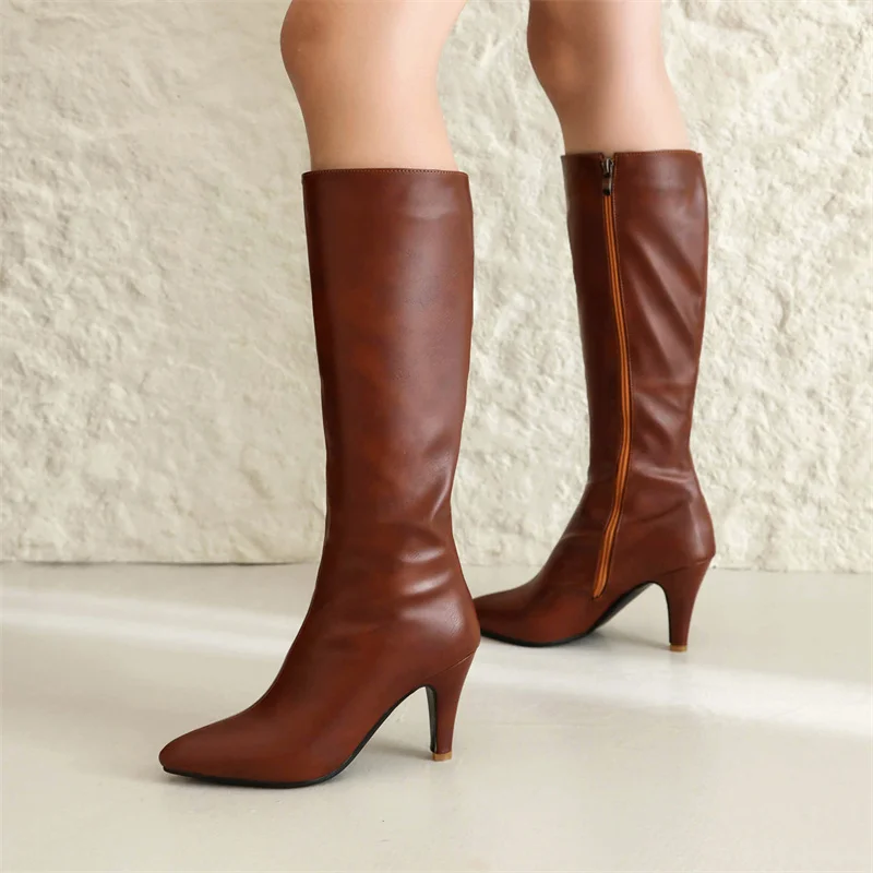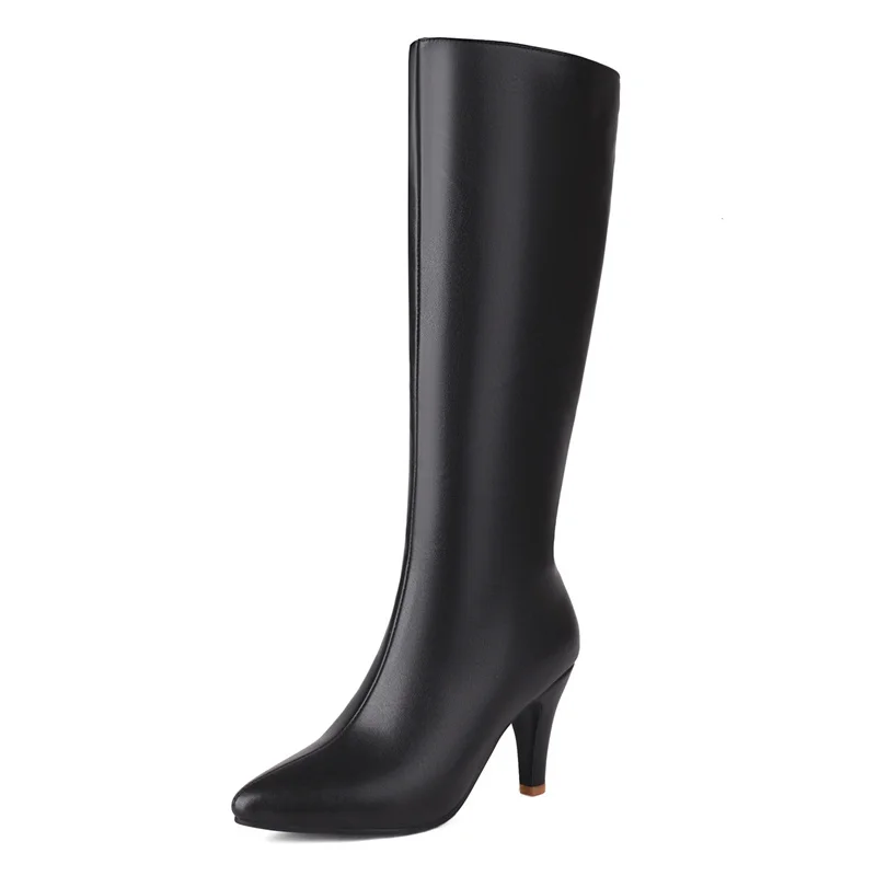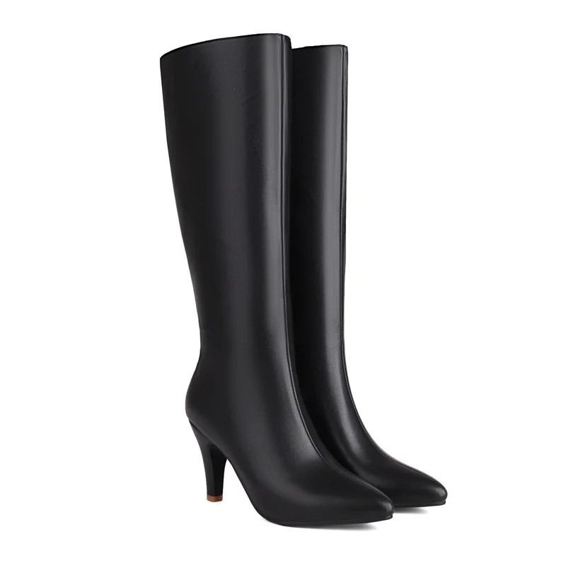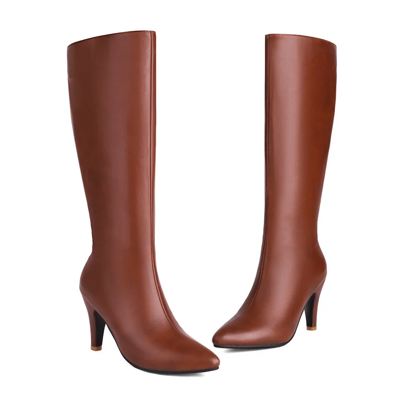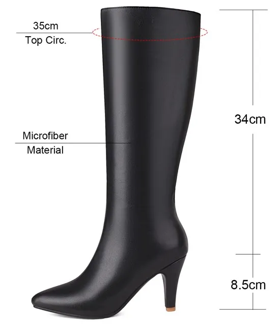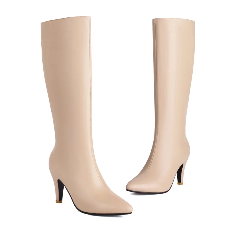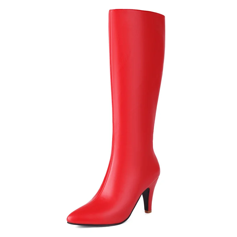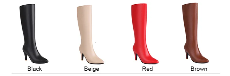 Big Size Autumn Winter Women Knee High Boots Chunky High Spike Heel Sexy Dress Casual Party Lady Red Black Brown Beige Pointed Toe Zipper Long Boots