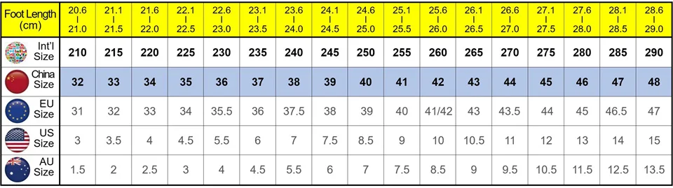 ! US, EU and AU Sizes are conversed from China Sizes based on foot length. Due to different size systems, the size conversion may cause slight error.