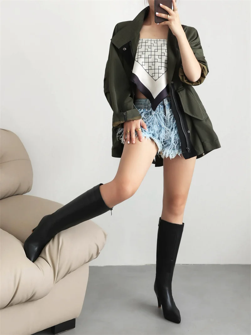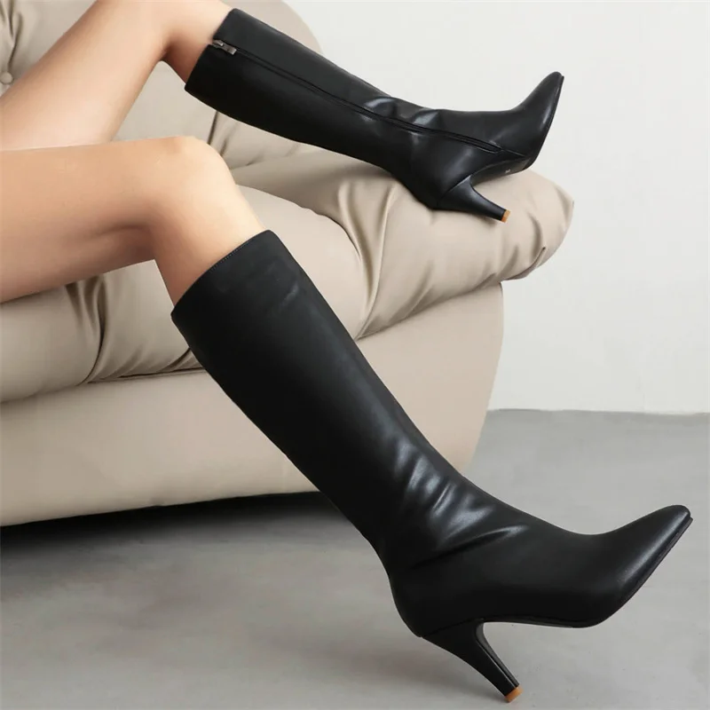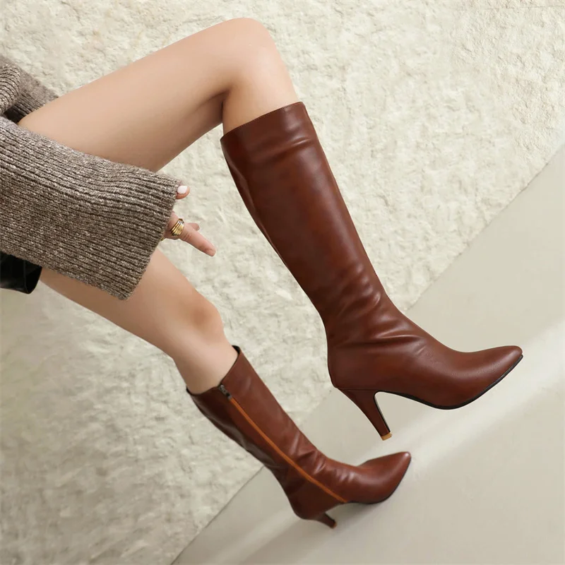Autumn Winter Women Knee High Boots Chunky Spike Heel Sexy Dress Casual Party Lady Red Black Brown Pointed Toe Zipper Long Boots