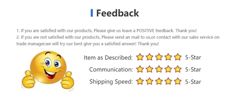 1.If you are satisfied with your order, please leave us all 5 stars including Item as Described. Communication and Shipping Speed.